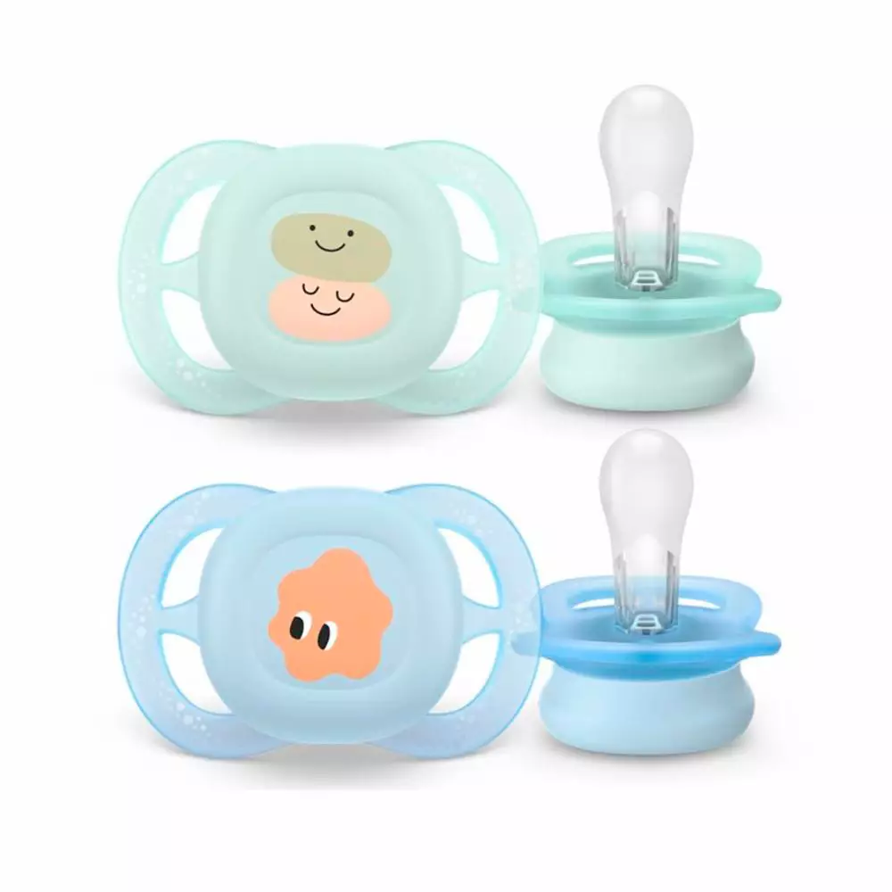 Avent Ultra Start Napp 0-2 månader i blå/grön (2 st) är speciellt utformad för nyfödda behov. Mycket liten och lätt napp passar perfekt i nyföddas mun och ansikte. Den stöder barnets naturliga sugbehov på ett säkert och behagligt sätt från födseln upp till två månaders ålder.