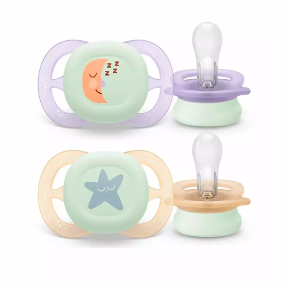 Avent Ultra Start nappflaska 0-2 månader Nighttime (2 st) är speciellt utformad för nyföddas behov. Den mycket lilla och lätta nappen passar perfekt i den nyfödda munnen och på ansiktet. Den stödjer barnets naturliga sugbehov på ett säkert och behagligt sätt från födseln upp till två månaders ålder. Napparna lyser i mörkret, vilket gör att du lätt kan hitta dem i sängen även när det är mörkt.
