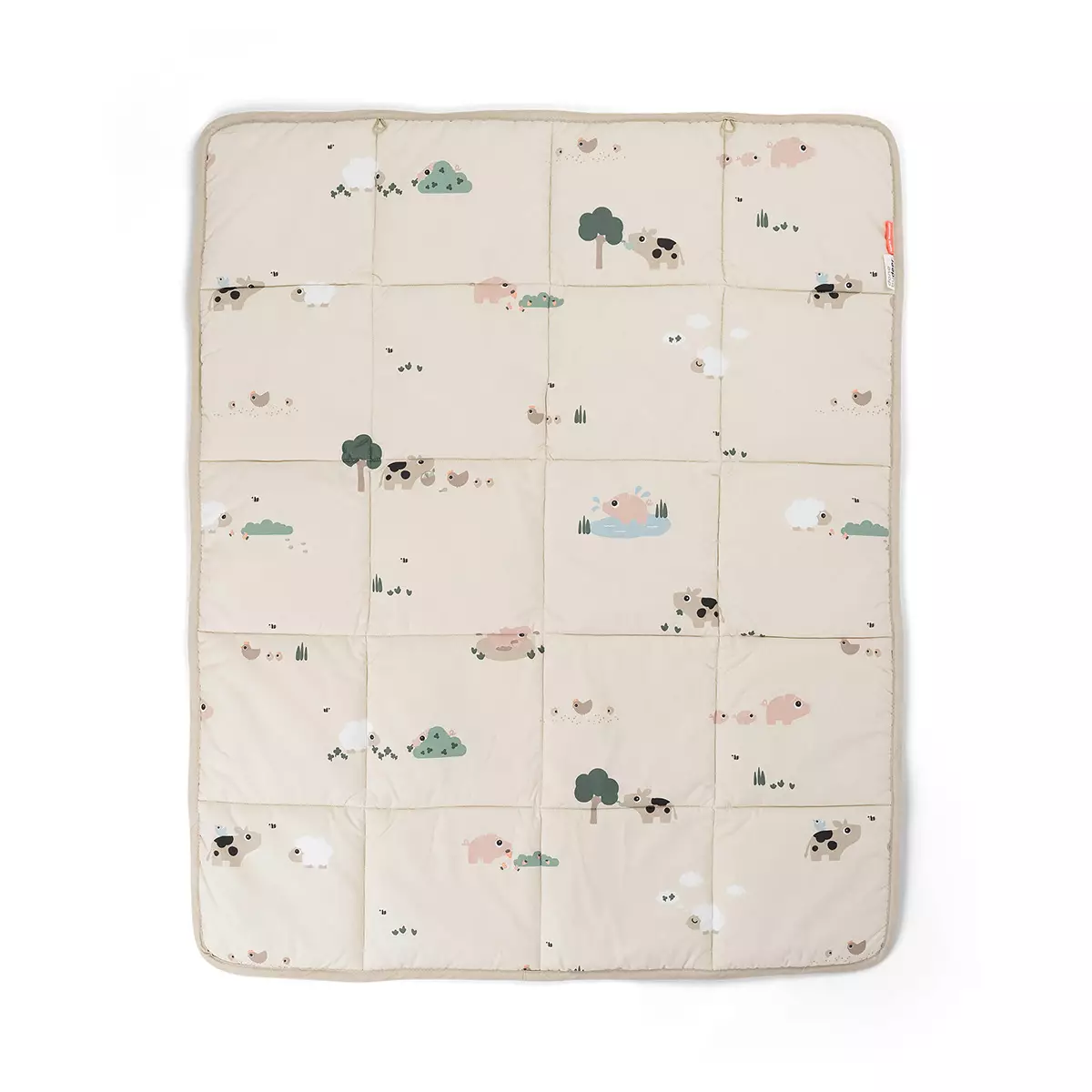 Babyleksakmatta Done By Deer Tiny Farm Sand är en tjock quiltad leksakmatta. Den vackra sandfärgen på mattan är en mysig plats där ditt barn kan njuta av lek på golvet. På lekmattan äventyrar söta gårdsdjursfigurer. Den andra sidan är enfärgad sand.