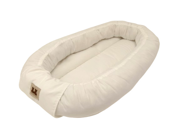 Storleken på sängen kan justeras med öglor. Obs: tygremmarna måste hållas utom räckhåll för barnet. Sängens tyg är behagligt mjukt i bomull och fyllning i ventilerande polyesterfiber. Sängen kan tvättas i 40 grader i maskin, forma när den är fuktig.