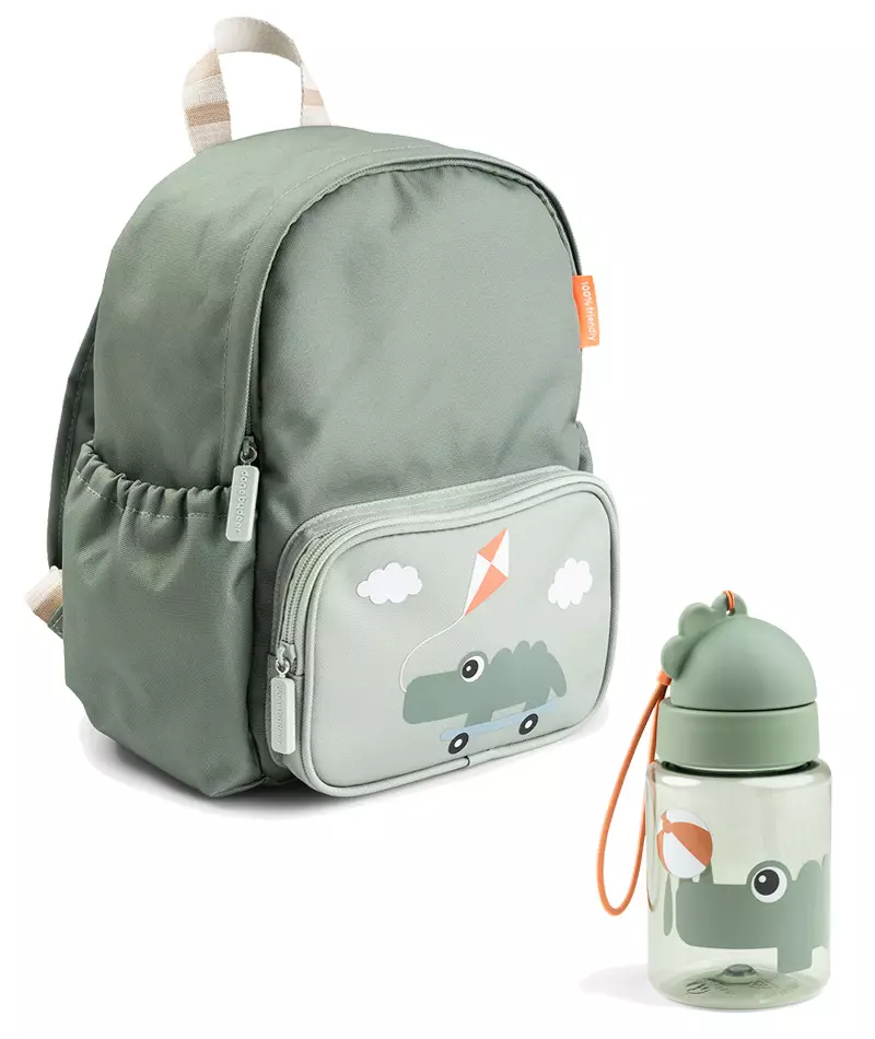 Ryggsäcken har en bild av en söt krokodil som flyger ett drake. Den har justerbara vadderade axelremmar och remmen kan fästas fram med en separat klämma. Ryggsäcken sitter bra på ryggen, och axelremmarna glider inte ner ens på mycket små barn när klämman är fastsatt.