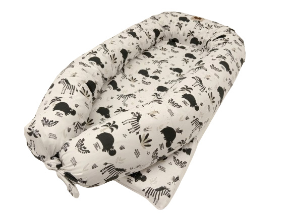 Vauvapesä Premium Anne & Mikael Hippo är en mjuk och säker säng för spädbarn med svartvita bilder av en hippopotam och en zebra. Den passar för nyfödda och upp till 4-6 månader gammal.
