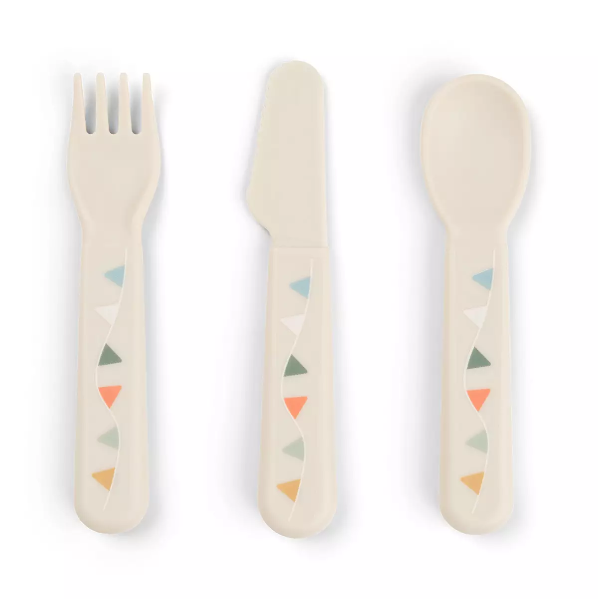 Besticksetet har mjuka, rundade kanter så att de är säkra för de små som övar. Setet innehåller en sked, en gaffel och en kniv. De söta besticken i färgen Celebration Sand har ett charmigt mönster.