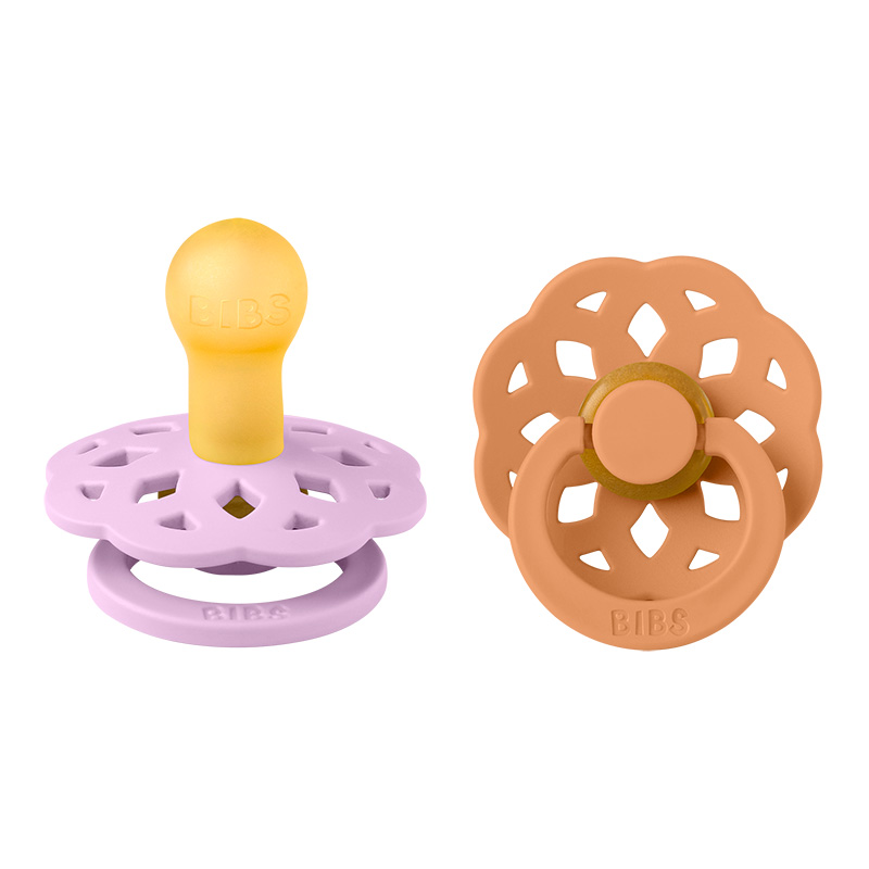 Bibs Boheme naturgummiduk 2-pack 0-6 månader, Violet Sky/Pumpkin är designad för att stödja amning och dess sugdel efterliknar bröstvårtan.