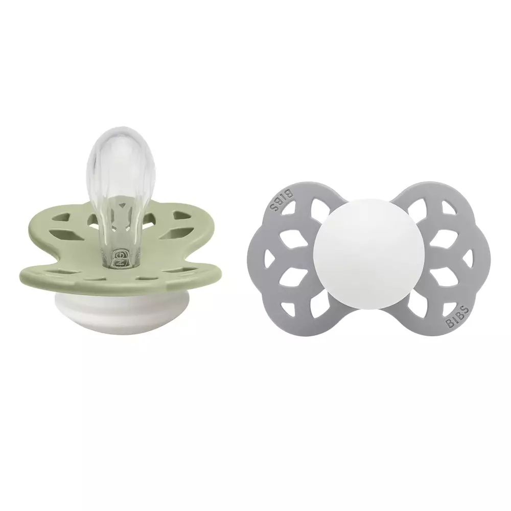Bibs Infinity silikonnappar 2 st 0-6 mån, symmetrisk, Sage/Cloud Night paket innehåller två olika nappar som passar för spädbarn upp till cirka 6 månaders ålder. Bibs Night-nappen har en mörk funktion i mitten som lyser i mörkret, vilket gör den lätt att hitta om den tappas bort.