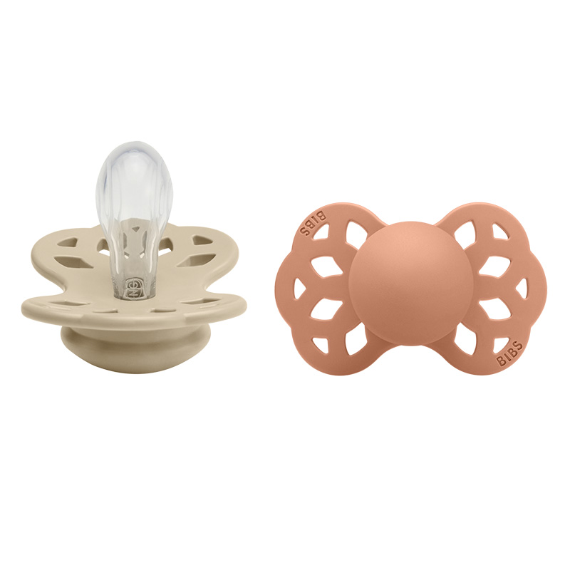 Bibs Infinity silikonnappar 2-pack 0-6 månader, symmetriska, Vanilla/Peach innehåller två nappar i olika färger som passar bebisar upp till cirka sex månader.