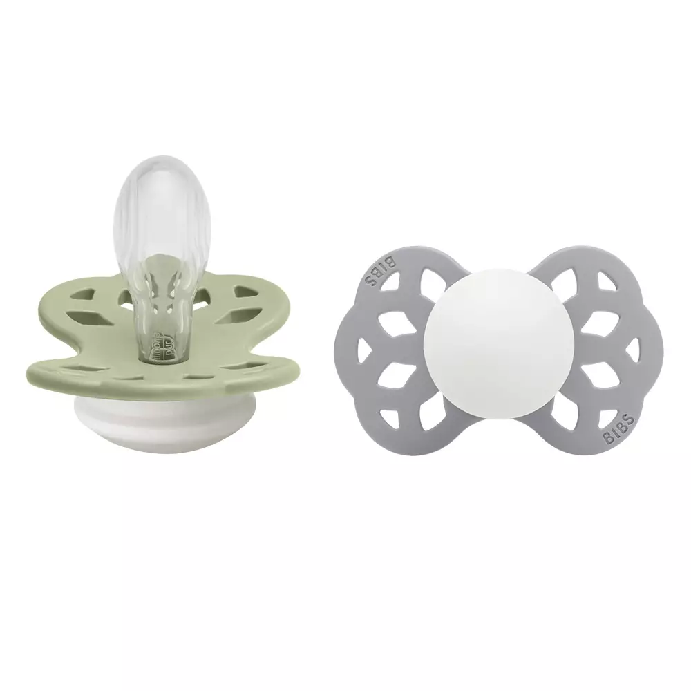 Bibs Infinity silikonnappe 2 st 6-18 mån, symmetrisk, Sage/Cloud Night paketet innehåller två nappar i olika färger, lämpliga för barn i åldern cirka 6-18 månader. Bibs Night nappen har en del som lyser i mörkret, vilket gör den lätt att hitta om den ramlar ut ur munnen.