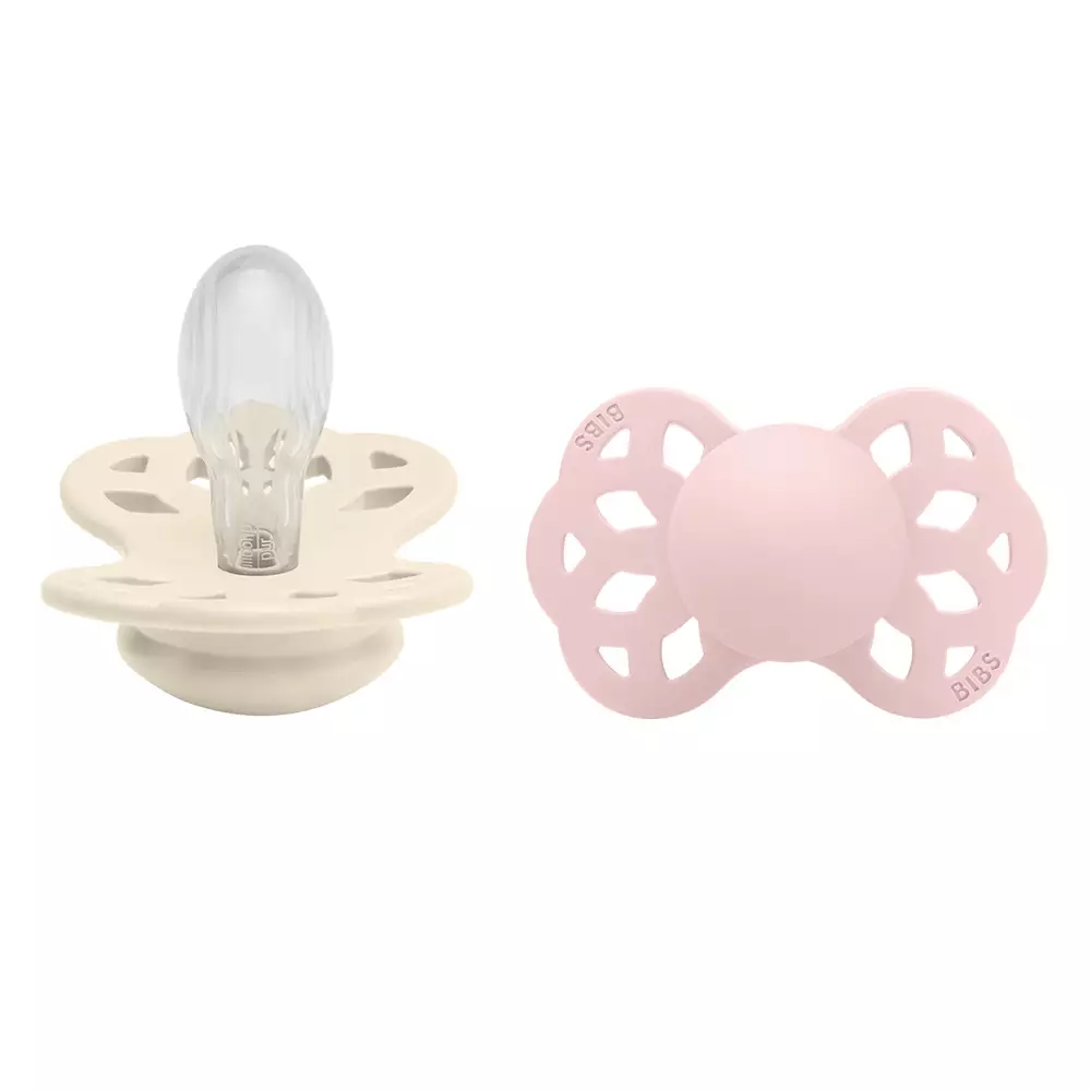 Bibs Infinity silikonnappar 2-pack 6-18 månader, symmetrisk, Ivory/Blossom i paketet finns två nappar i olika färger som passar från sex månader till ett och ett halvt år gammal.