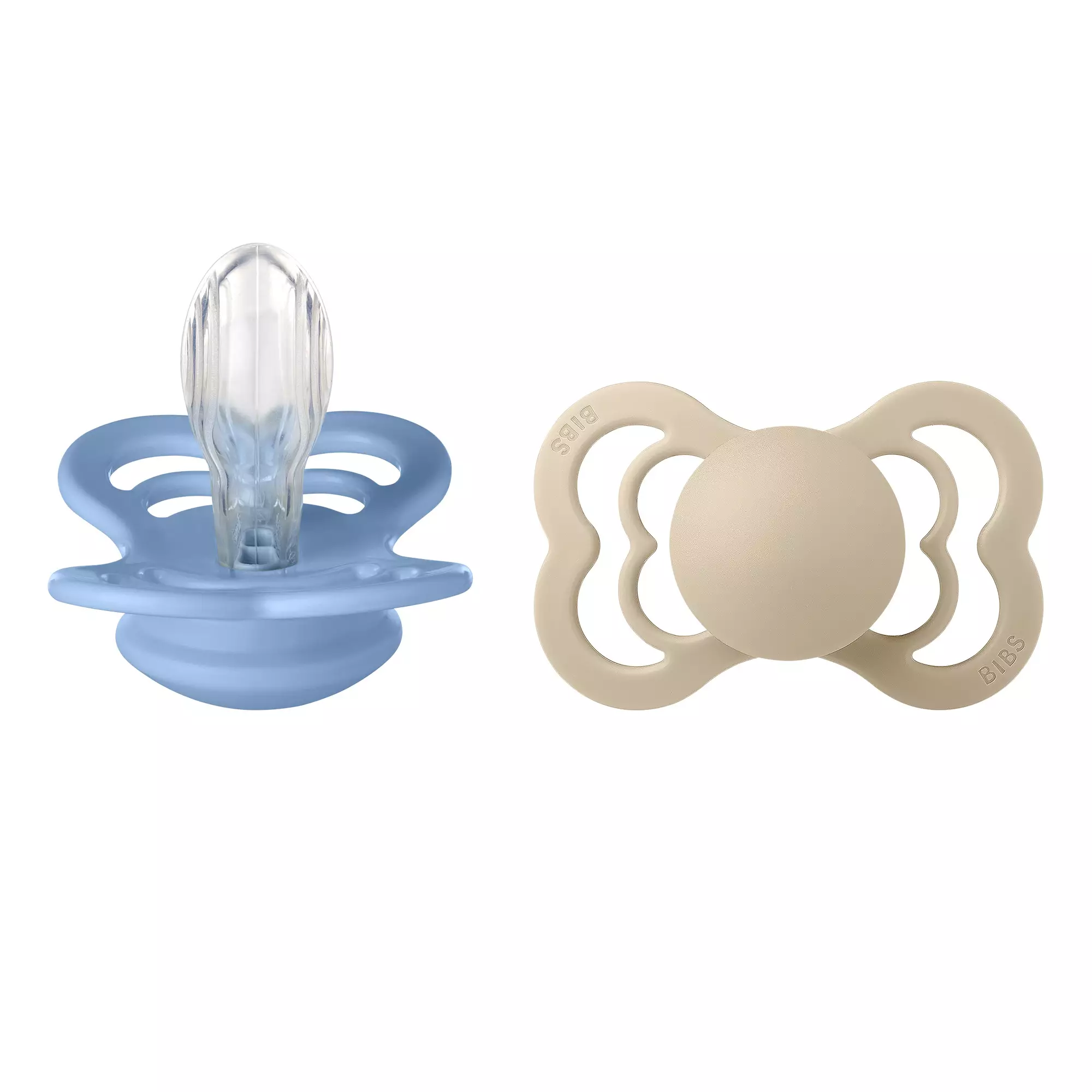 Bibs Supreme silikonnap 2 st 6-18 månader, Vanilla/Sky Blue -paketet innehåller alltså två nappar i olika färger, som passar från sex månader upp till cirka 18 månader.