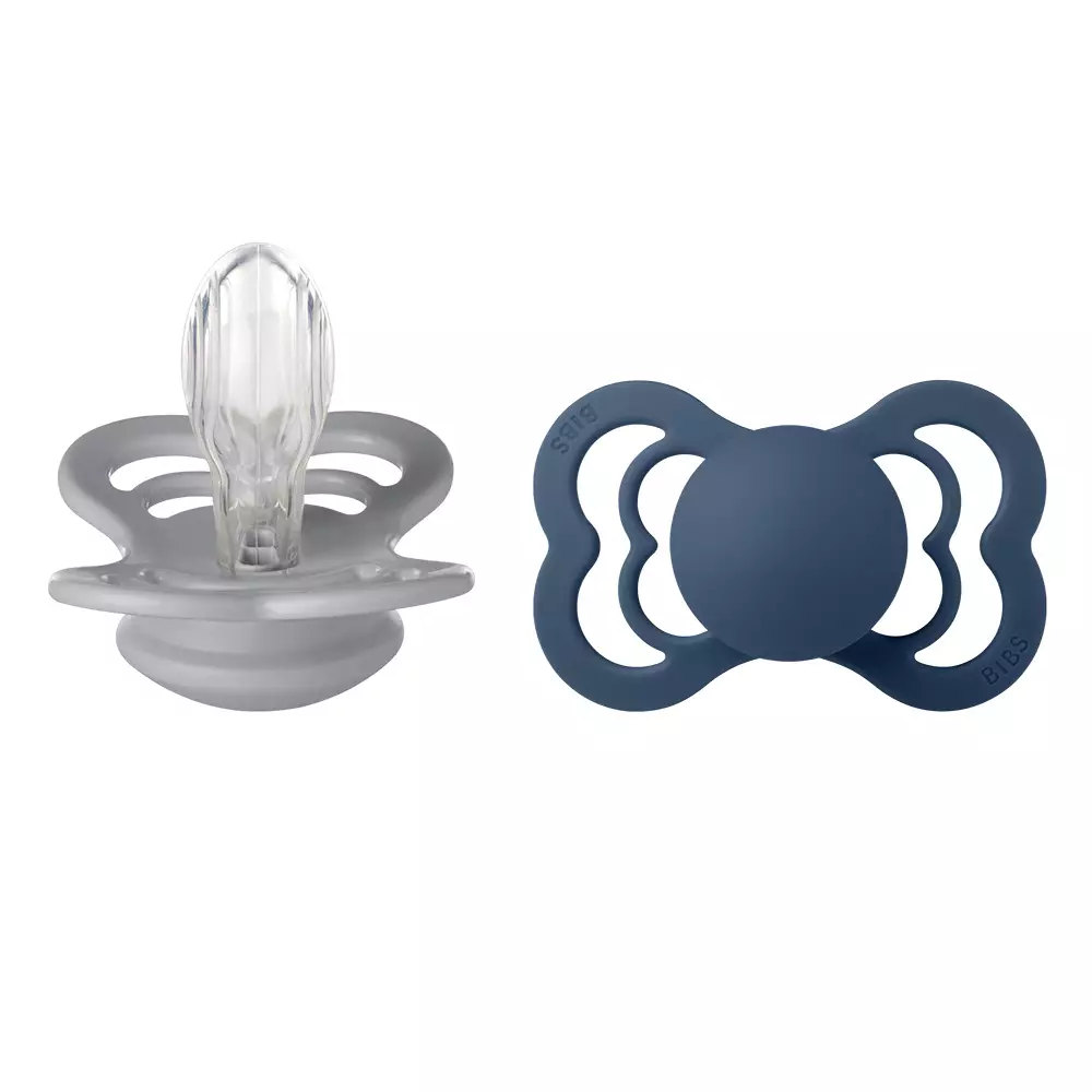 Bibs Supreme silikonnappar 2 st 6-18 månader, Cloud/Steel Blue paketet innehåller två nappar i olika färger, som passar från sex månader till cirka 18 månader.