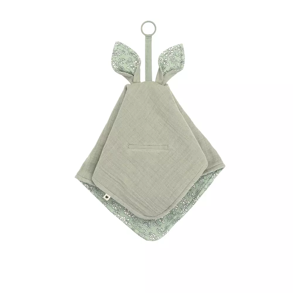 Mjuk sovkompis för din baby. Snuttefilt i mjukt muslin med Bibs x Liberty grönt blommönster på insidan och kängururosetter.