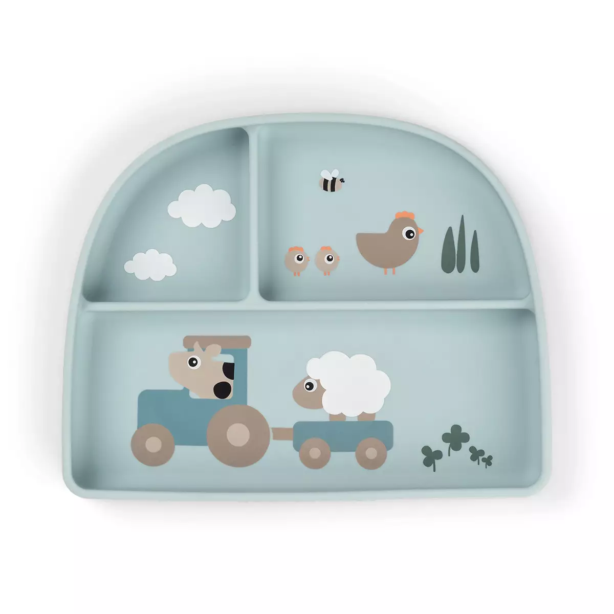 Det praktiska sugkoppsunderlägget förhindrar barnet från att skjuta, välta eller kasta skålen på golvet. Tallriken är designad för daglig användning och tål diskmaskin, mikrovågsugn, ugn samt frysning. Tallriken är tillverkad av livsmedelsgodkänd silikon, som är BPA-fri och fri från skadliga ämnen.