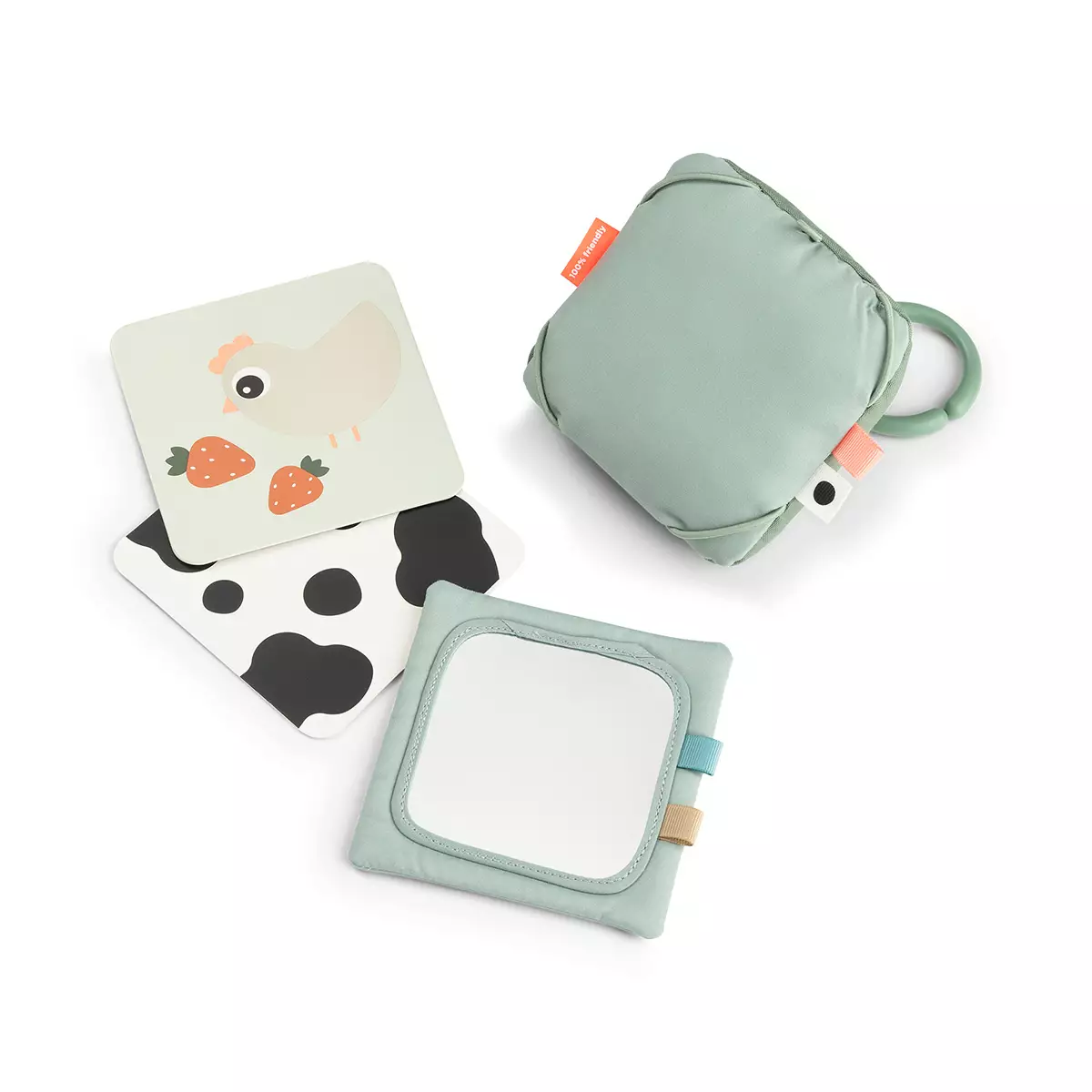 Done By Deer aktivitetskort Kontrastkort Tiny Farm Green innehåller två dubbelsidiga kontrastkort, en spegel och ett fäste för bytesbara bilder. Aktivitetskorten stimulerar ditt barns syn.