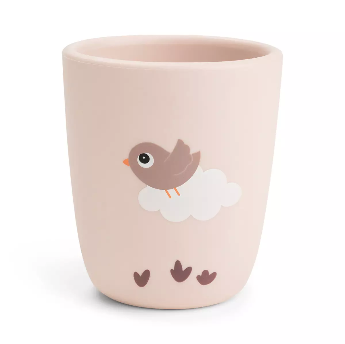 Done By Deer silikonmugg mini Playground Powder är designad för små händer och stiliga dukningar. Barnet kan enkelt öva på att dricka från denna mugg, och tack vare den silikonbelagda ytan hålls muggen säkert i handen. Birdee-karaktären har även fått äventyra på muggens utsida.