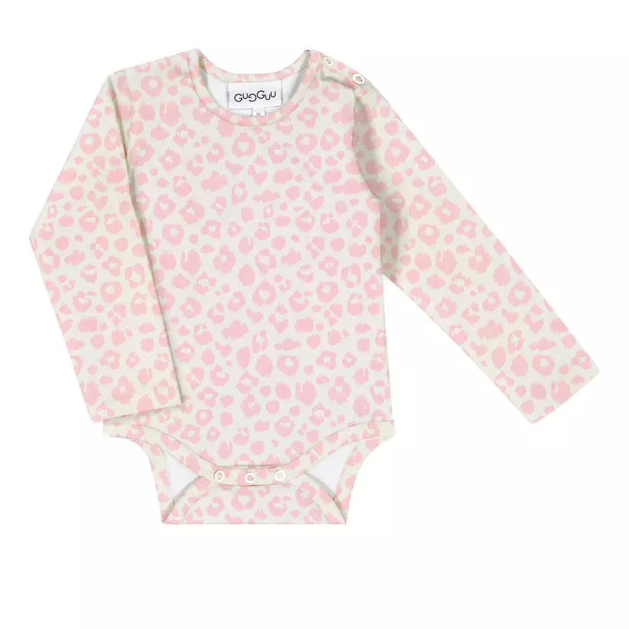 Gugguun mjuk babybody med leopardsmönster. Tillverkad av högkvalitativ ekologisk bomull.