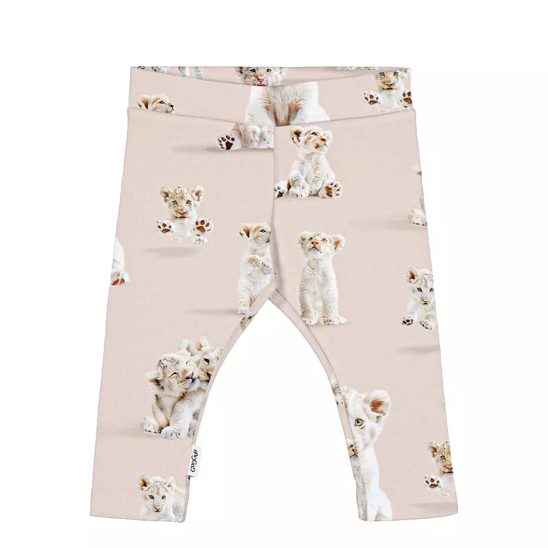 Gugguu Baby Print Leggings Lioncubs är mjuka leggings i ekologisk bomull för spädbarn. Byxorna har ett vackert och sött mönster av lejonungar och en bred midjeresår.