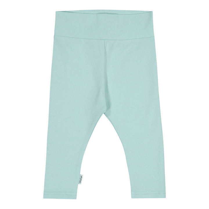 Mintfärgade bomullleggings från Gugguu för baby. Byxorna har bred midjeresort och är bekvämt mjuka för barnet.