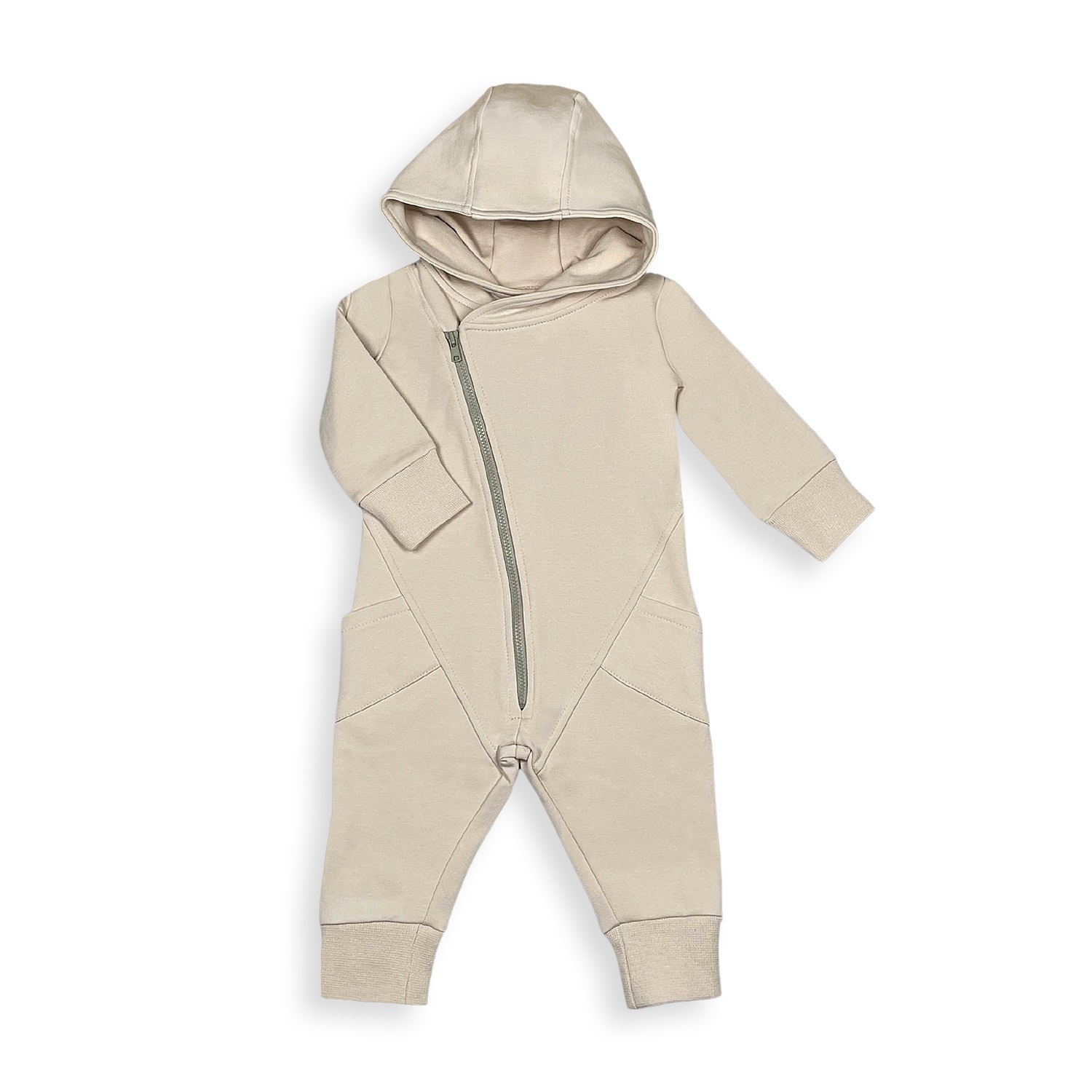 Den vackra overallen är tillverkad av mjuk bomull. Dragkedjan går elegant snett åt sidan och den stora huvan håller barnet varmt. Passar bra på sommarens kalla kvällar för att hålla bebisen varm.
