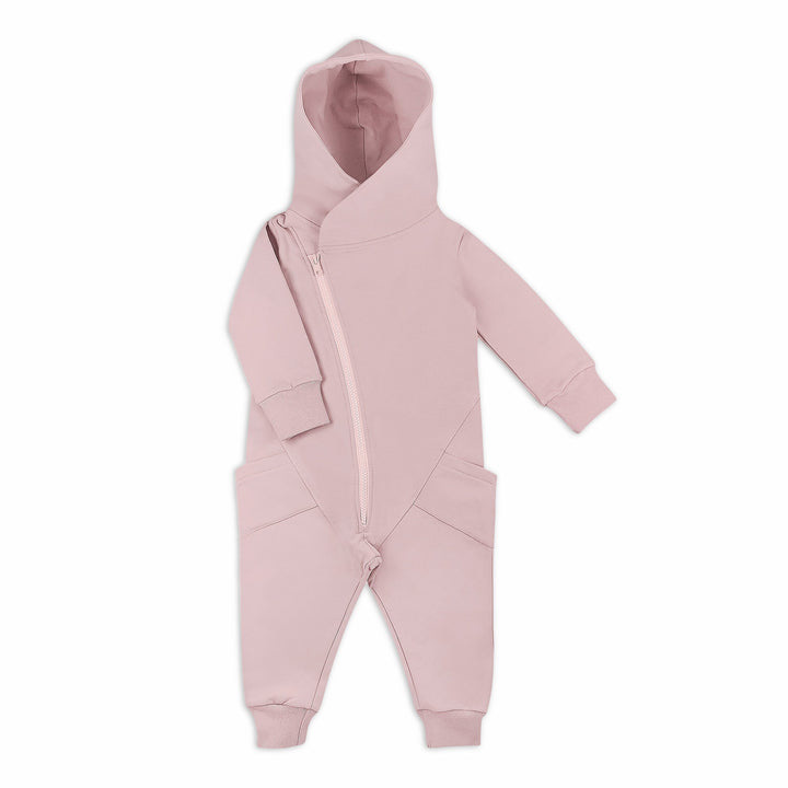 Den vackra ljuslila collegeoverallen är tillverkad av mjuk bomull. Dragkedjan följer en vacker linje på sidan och den stora huvan håller bebisen varm. Passar bra för kyliga sommarkvällar för att hålla bebisen varm.