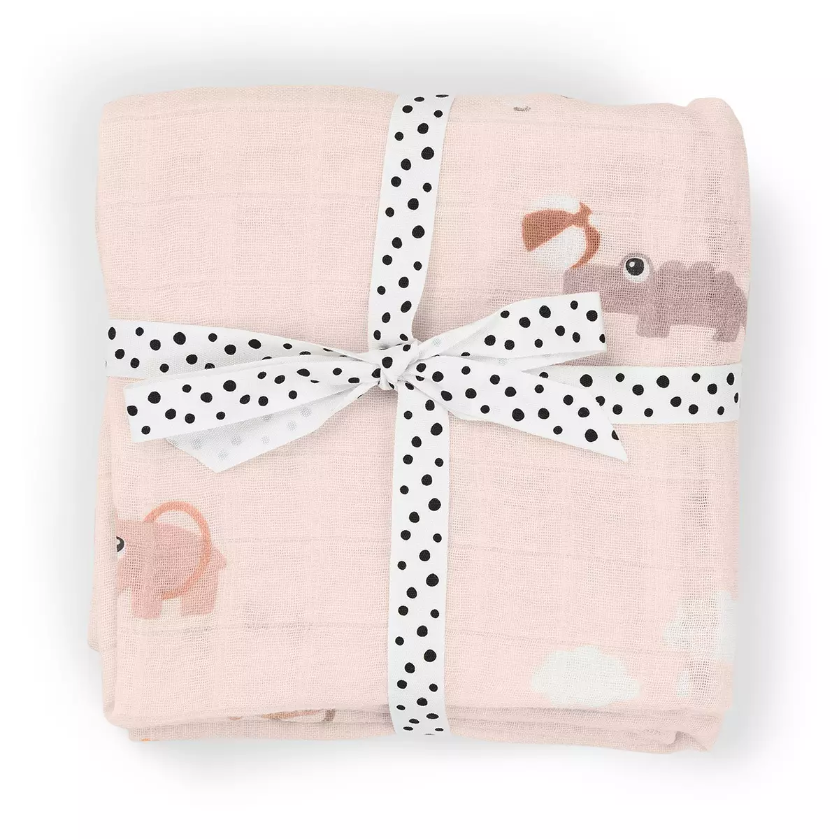 Harsoliinat Done By Deer Playground Powder är mjuka muslinfiltar som kan användas för många olika ändamål vid babyvård. I de söta färgglada bomullstygerna medverkar Done By Deers glada figurer. Paketet innehåller två harsoliinaa.