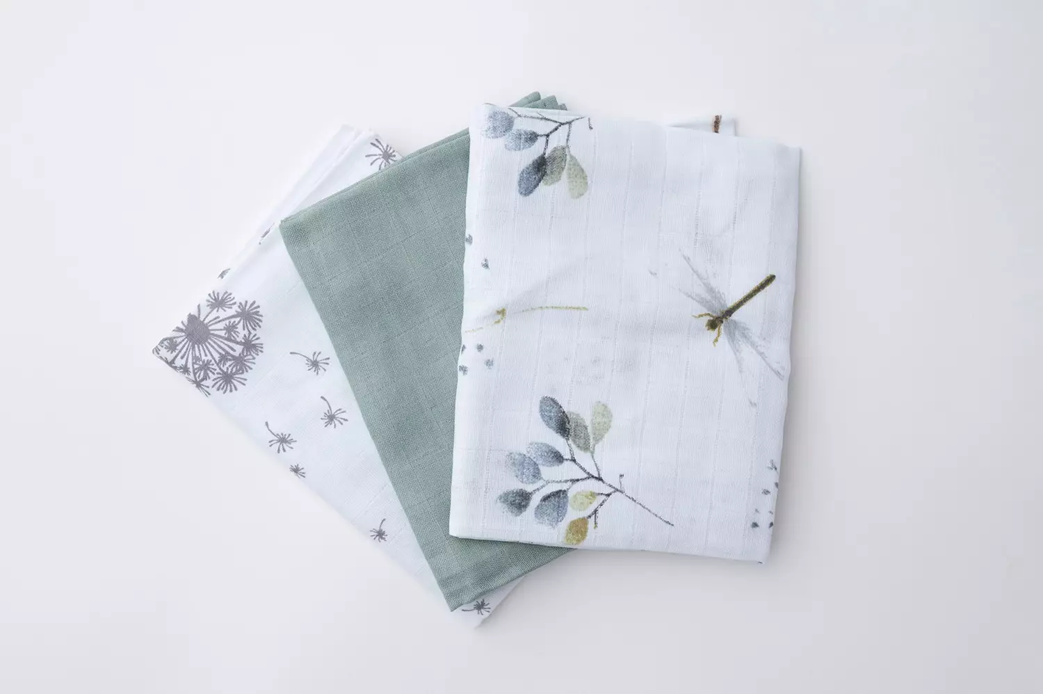 Muslinbindor Lillanel Premium 3-pack i grönsättet innehåller tre vackra muslinbindor av högkvalitativ bomull. Mycket mjuka muslinbindor är mångsidiga för babyvård. Paketet innehåller två mönstrade muslinbindor och en i grön färg.