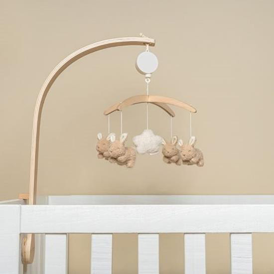 Little Dutch mobil Baby Bunny är en söt trä musikmobil för barn, med fyra mjuka kaniner och ett moln som hänger. Mobilen är lätt att fästa vid spjälsängen. Musikmobilen spelar en mjuk melodi medan leksakerna rör sig ovanför barnet.