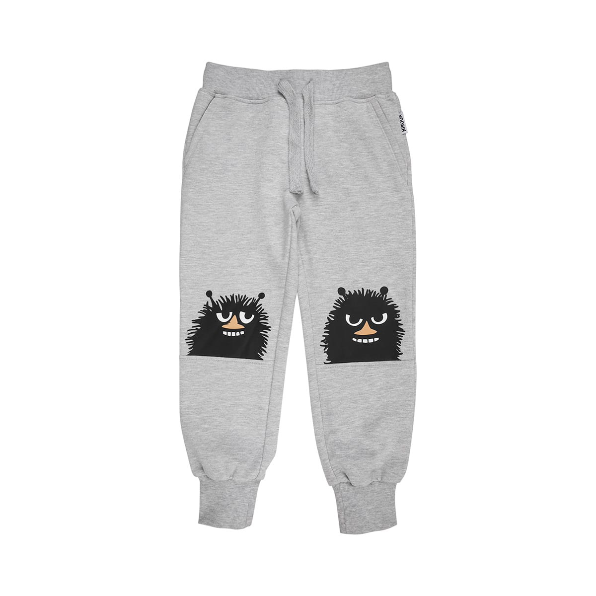 Grå Muumi joggingbyxor med roliga bilder av den listiga Haisuli på knäna.