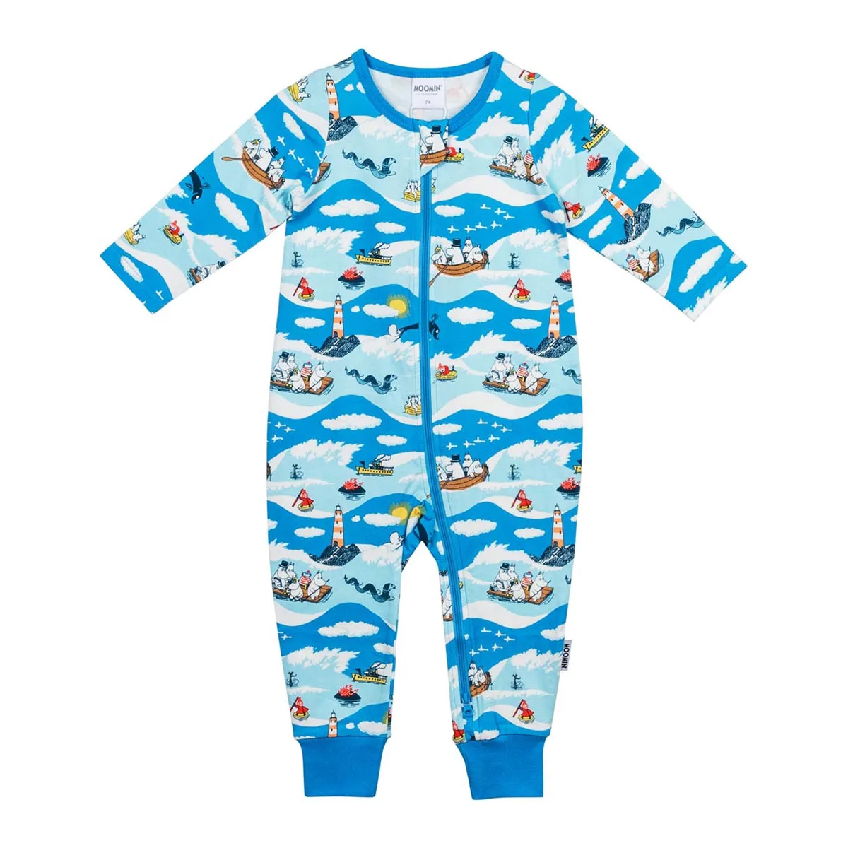 Blå Muumi-pyjamas med lång ben och ärmar. Lång dragkedja gör det lätt att klä på.