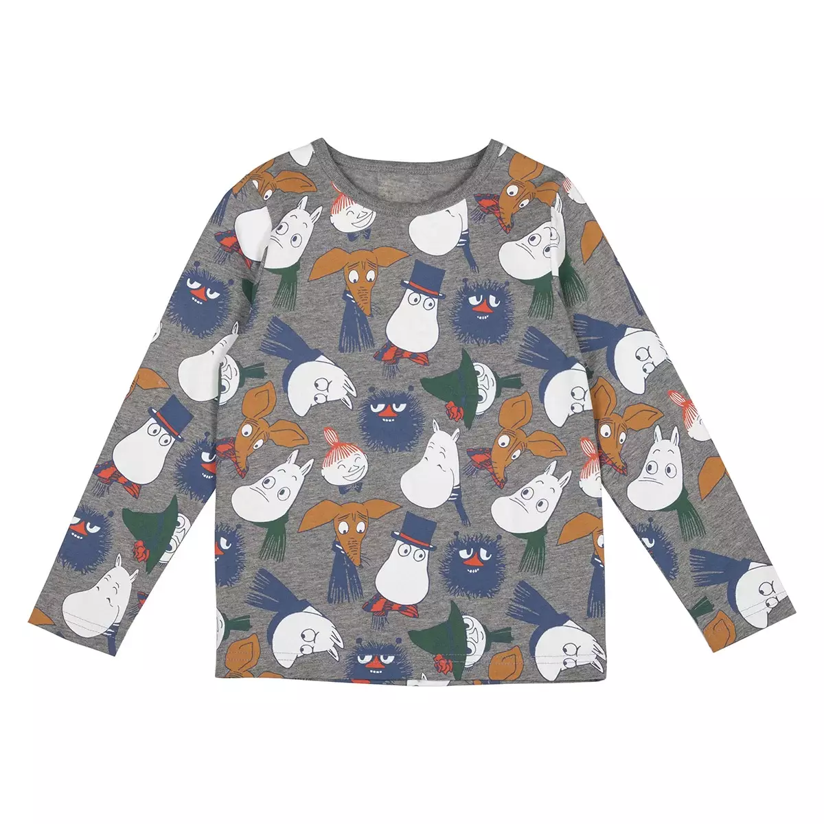 Grå, långärmad Muumitröja är gjord av mjuk ekologisk bomull. Tröjan har bilder av invånarna från Mumindalen med roliga ansiktsuttryck.