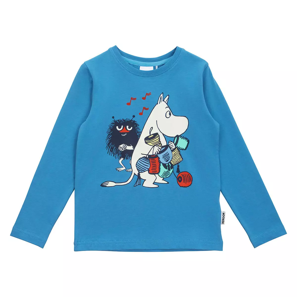 Martinex Muumi Dekorations T-shirt i blått är gjord av mjuk ekologisk bomull som känns behagligt mot barnets hud. Den blå tröjan har en bild av Muumipeikko och Haisuli i prydnadsgrenar.