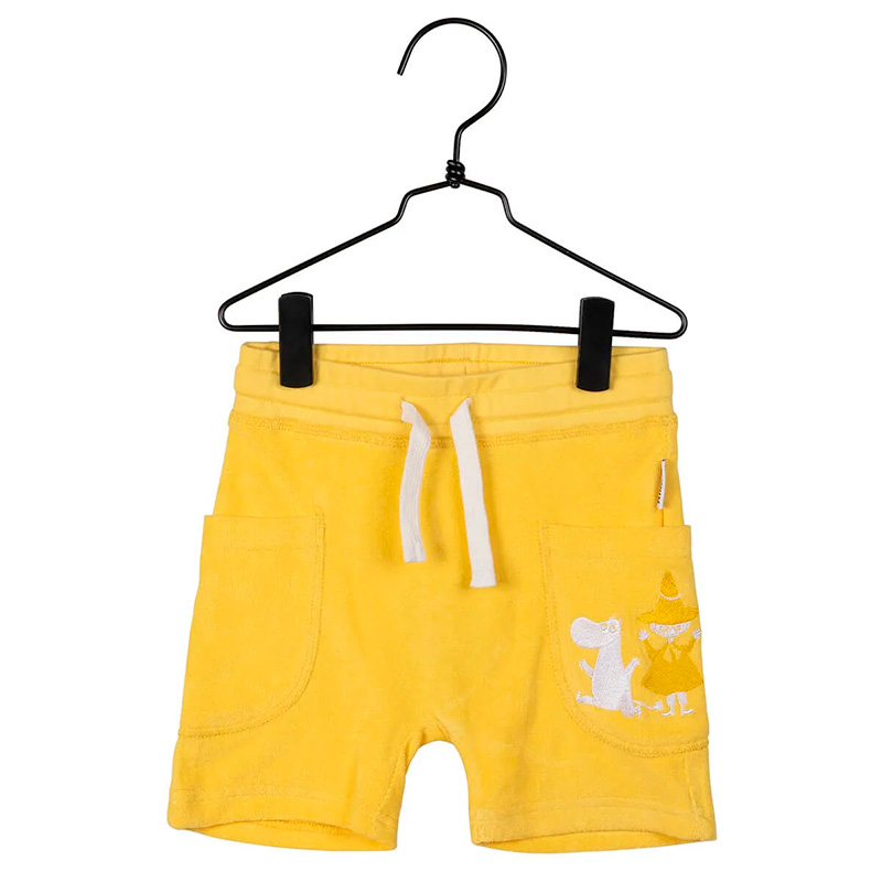 Gula Muumi frotteeshorts för barn. Tillverkade i mjukt och elastiskt material.