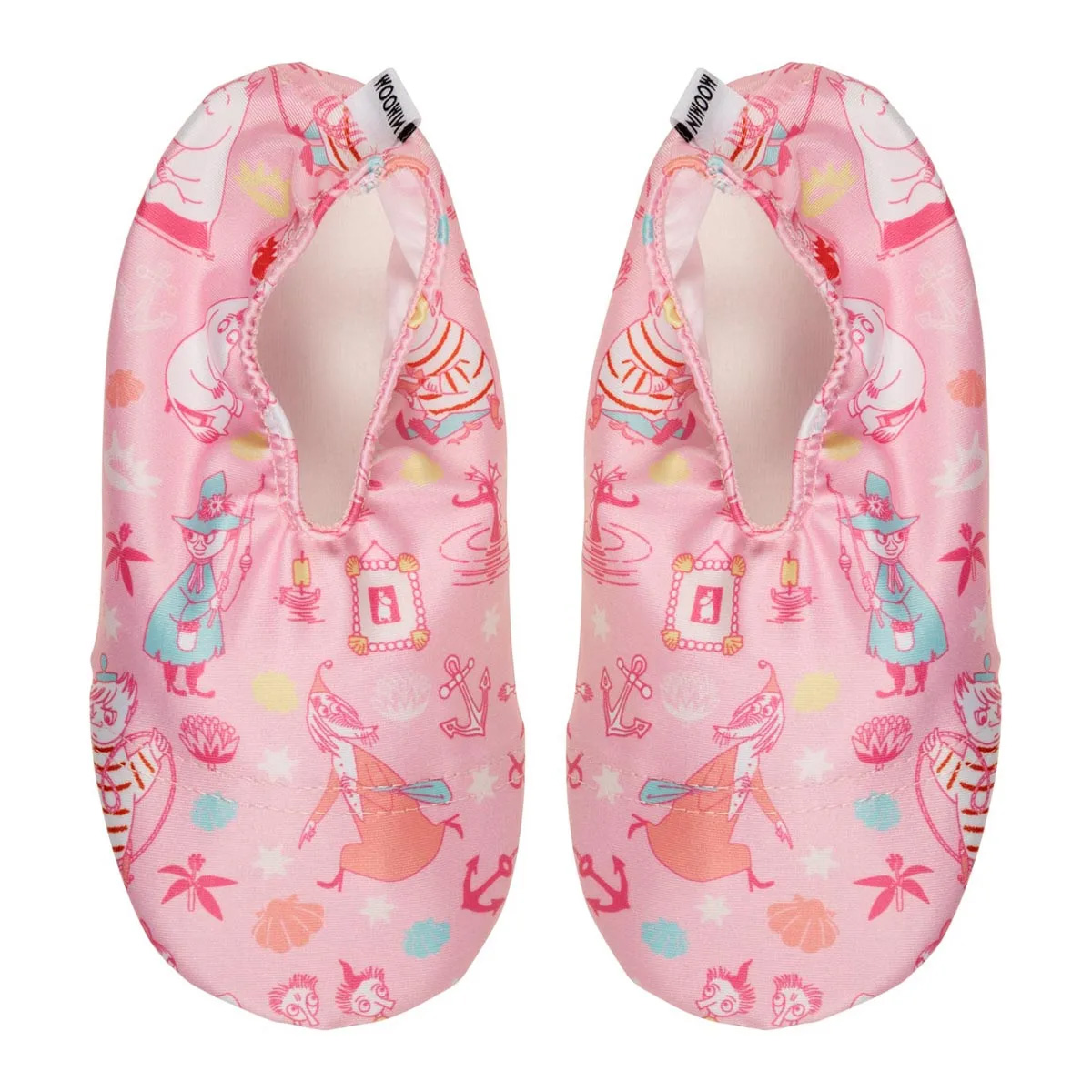 Rosa Muumi halkskyddsskor är utmärkta för simning och inomhusbruk som inneskor. Halkfri sula. Roligt Jokiranta-mönster.
