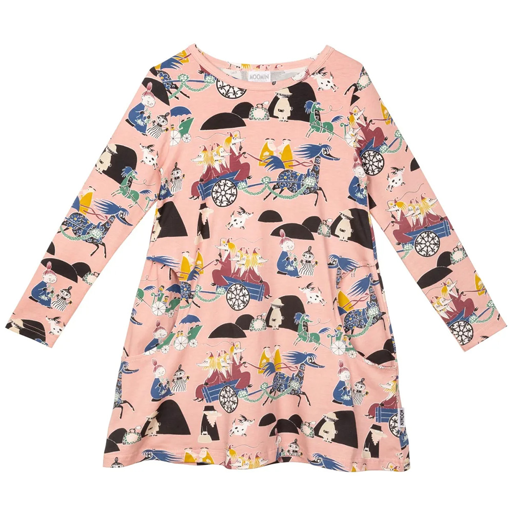 Vacker A-linjeformad Muumi-klänning för barn. I den rosa klänningen äventyrar figurer från Muumidalen.