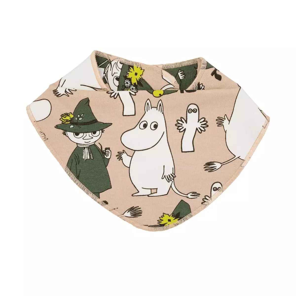 Martinex Muumi Kuomat Scarf beige är en vacker knäppbar scarf och dregglis för spädbarn. Den beige scarfen är vändbar och har ett gulligt Kuomat-mönster.