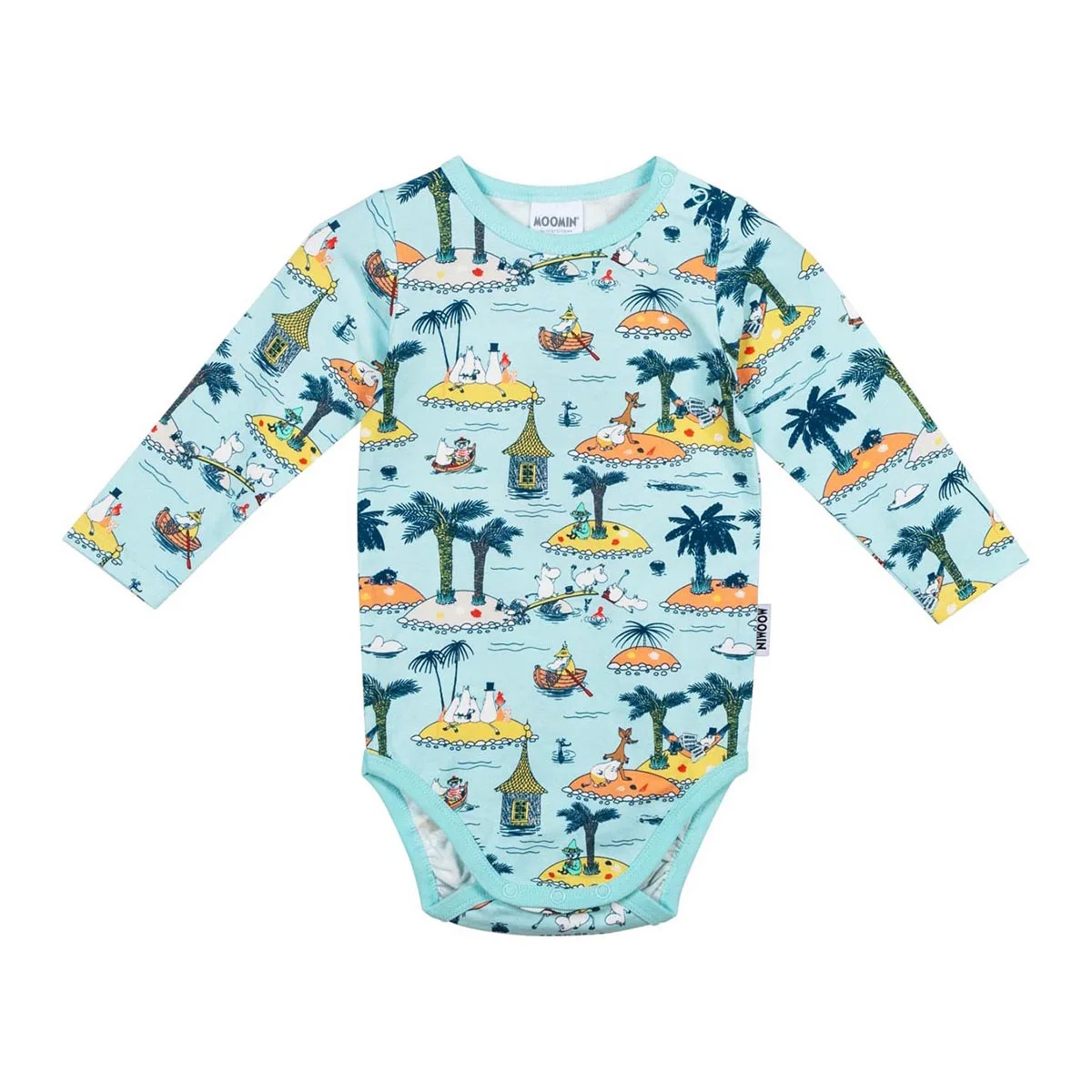 Ljusblå Muumi-body där Muumidalen har gett sig ut på strandsemester. Ekologisk långärmad body.