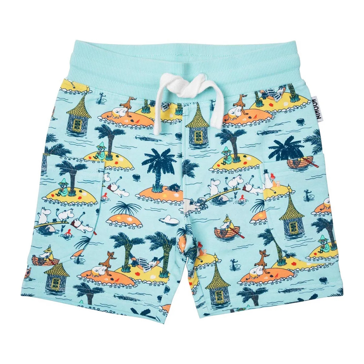 Ljusblå Muumi shorts med somrigt Loma-mönster. Elastiskt midjeband med dragsko och fickor på sidorna.