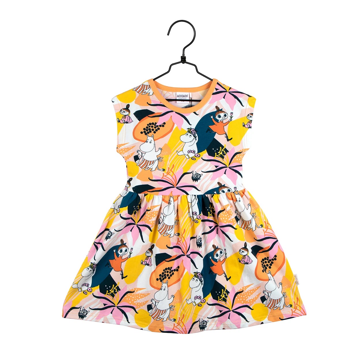 Kortärmad Muumi sommardress med färgglatt Makeapassio-mönster. Tillverkad enligt Öko-Tex-standarder. Ekologisk bomullstrikå.