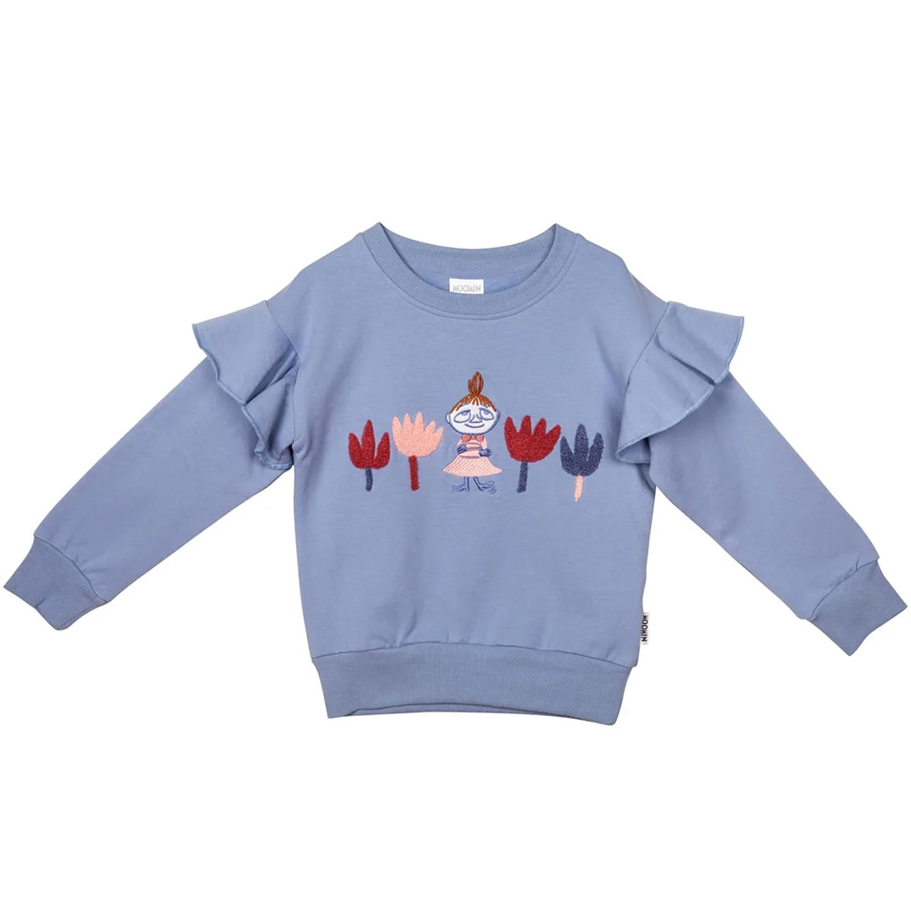 Blå Muumi collegetröja med bild av Lilla My. Vackra volanger vid ärmsömmarna, avslappnad oversized modell.