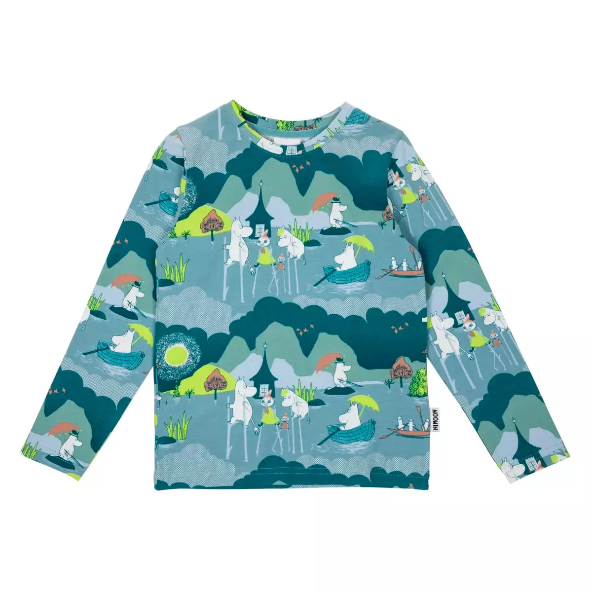 Blå långärmad Muumi-tröja, tillverkad av mjuk ekologisk bomullstrikå.