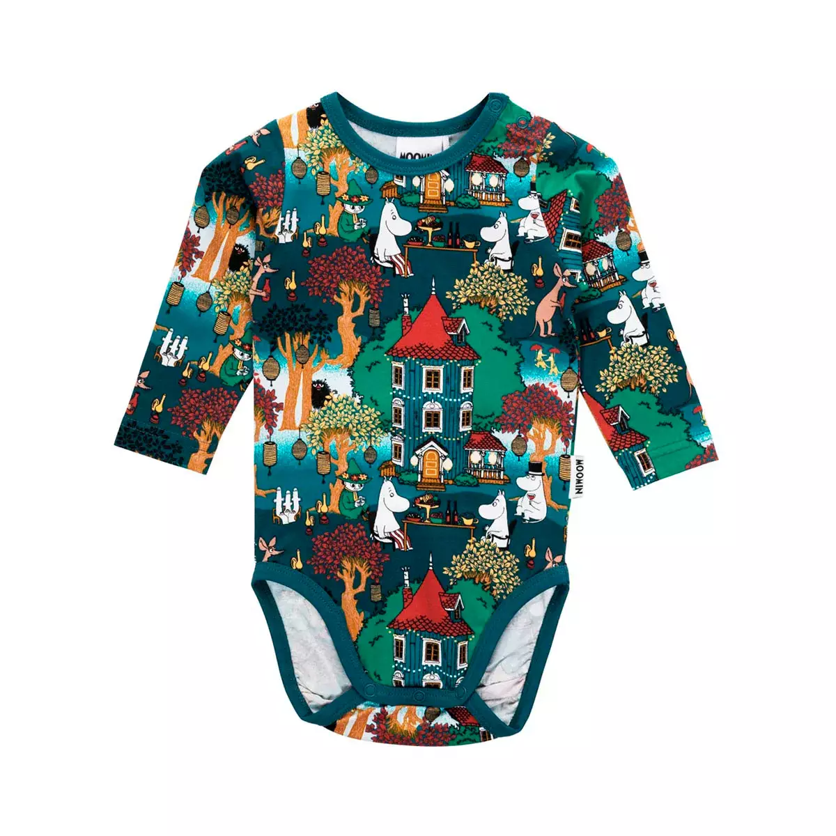 Blå Muumi-body där invånarna i Mumin-dalen njuter av stämningsfulla trädgårdsfester. Ekologisk bomull långärmad body.