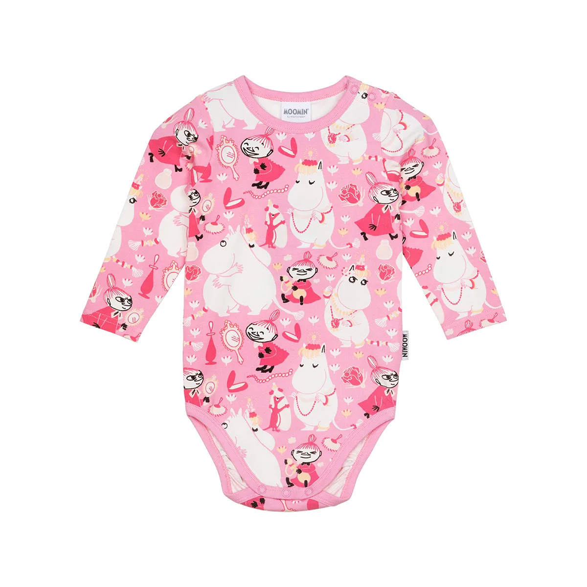 Rosa Muumi bodysuit där Niiskuneiti och Lilla My stylas med smycken. Långärmad bodysuit i ekologisk bomull.