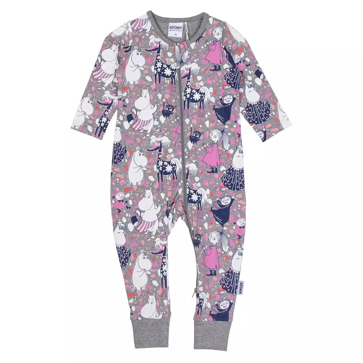 Grå Muumi-pyjamas med långa ben och ärmar. Den långa dragkedjan gör påklädningen enklare.
