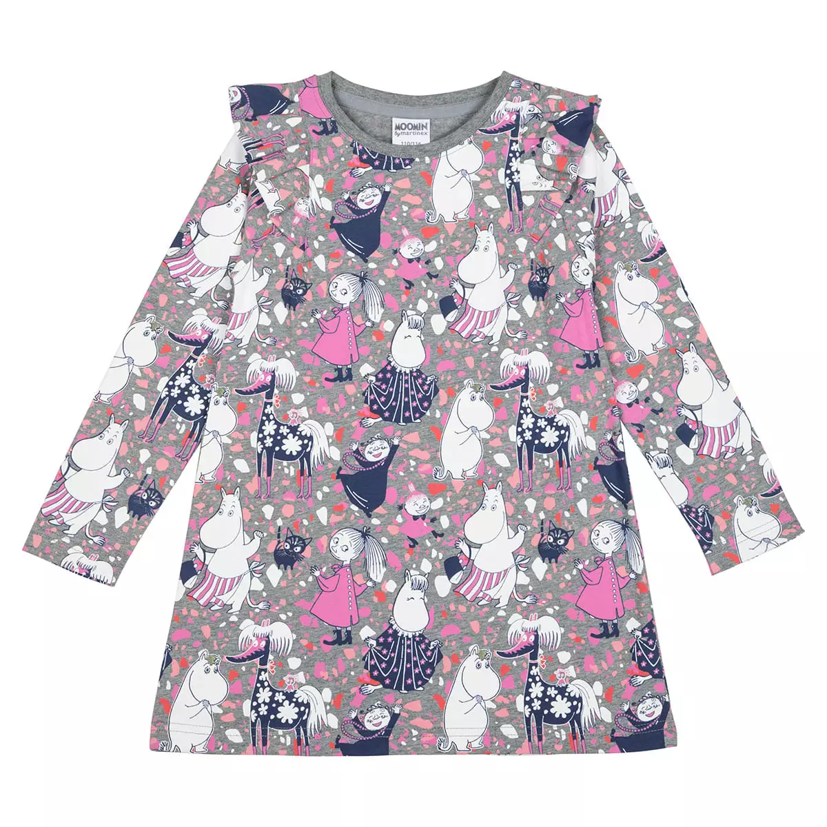 Martinex Muumi Snöflingor Tunika grå är en underbar Muumi-tunika. Tunikan passar både till vardag och fest, och är lätt att matcha med andra kläder. I den grå klänningen beundrar Muimalandets invånare ankomsten av den första snön tillsammans.