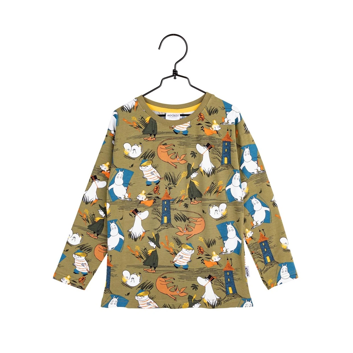 Olivgrön, långärmad Mumin tröja som är tillverkad av mjukt ekologiskt bomullstrikå.