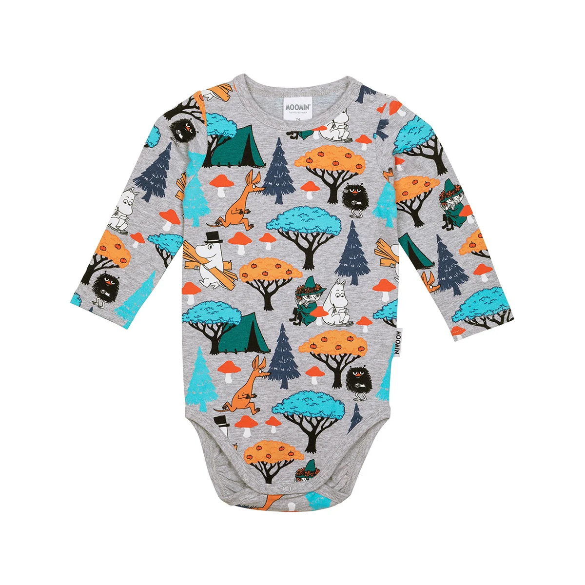 Grå Muumi-body där Mumin-dalen njuter av hösten i skogen. Långärmad body i ekologisk bomull.