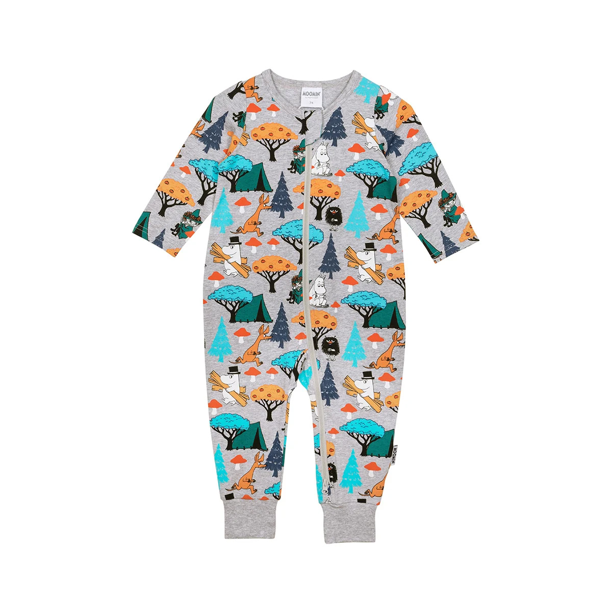 Grå Muumi pyjamas med långa ben och ärmar. Lång dragkedja för lätt påklädning.