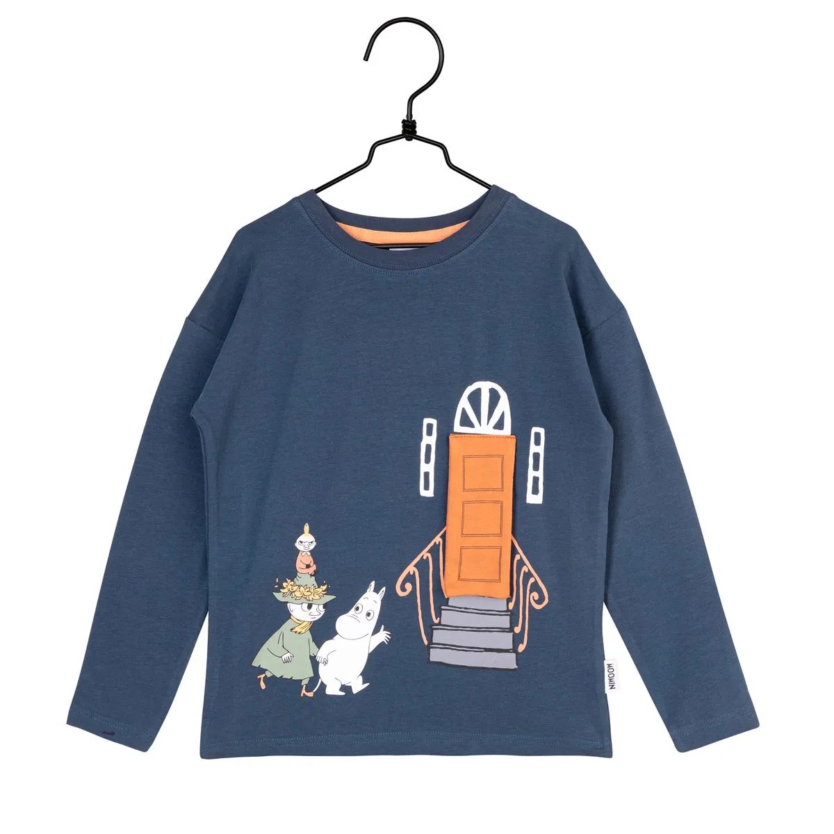 Mörkblå långärmad Mumintröja i ekologisk bomull. Tröjan har en rolig dörr med kardborrefäste.