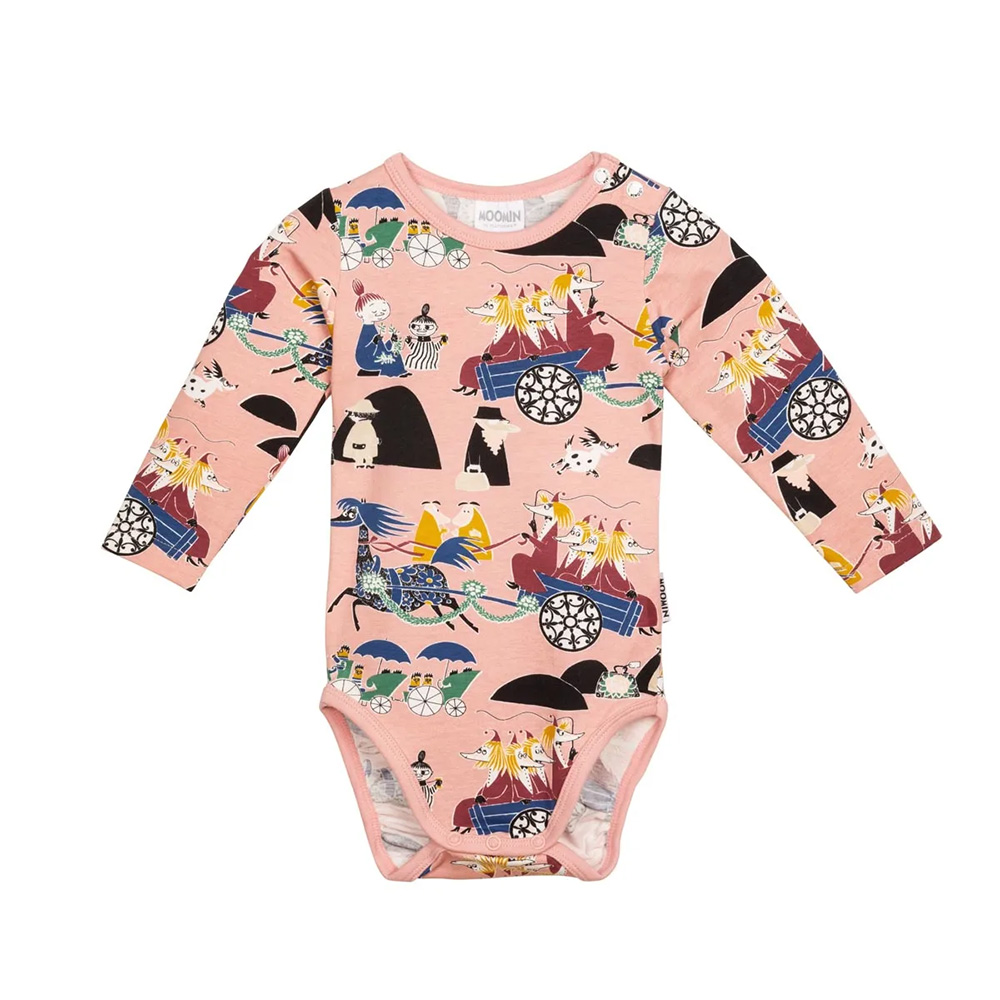 Rosa Muumi bodystocking med figurer fra Moomindalen. Langærmet bodystocking lavet af økologisk bomuld.