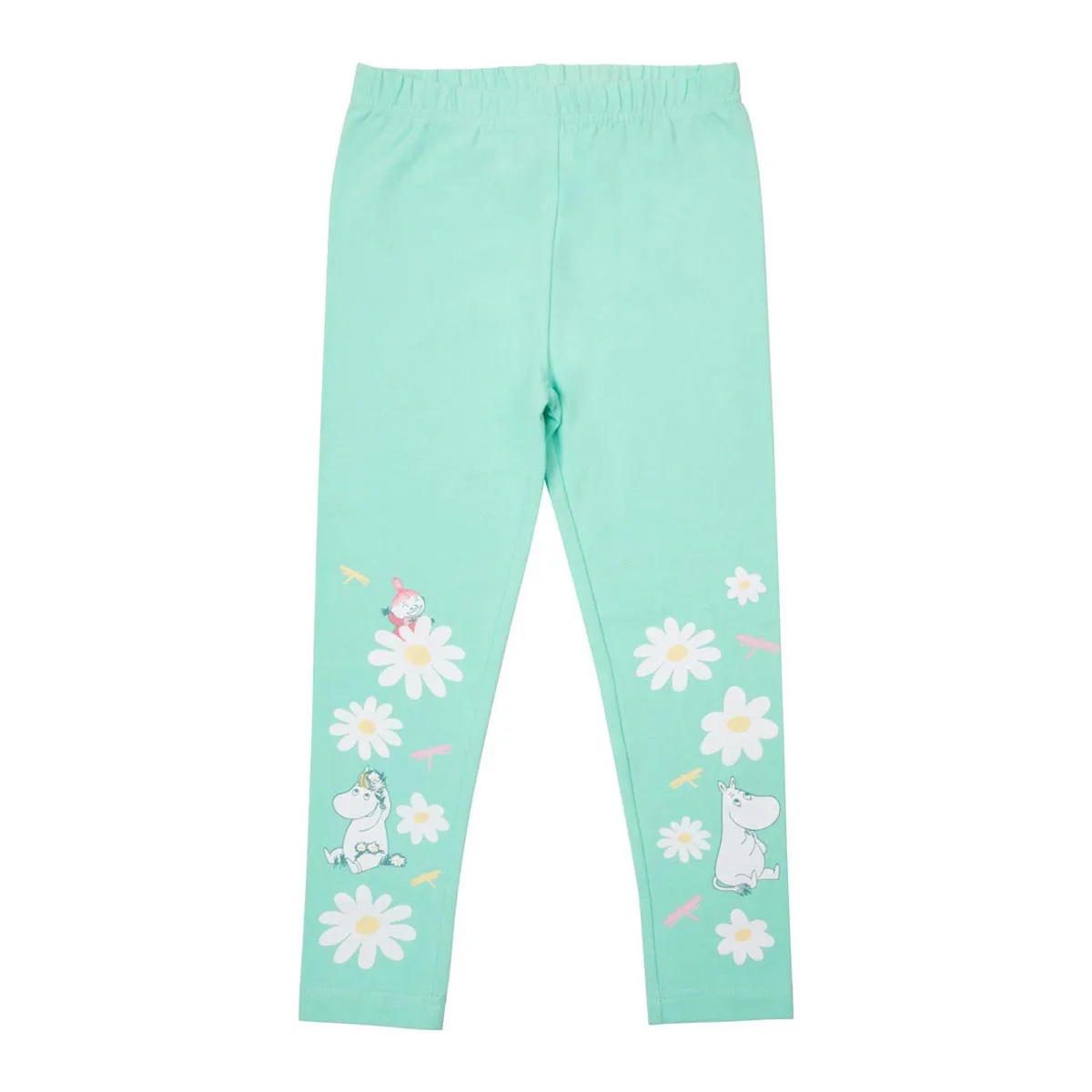 Mintgrön Muumi leggings i ekologisk bomullstrikå. Ben med vackert Luonnokukka-mönster.