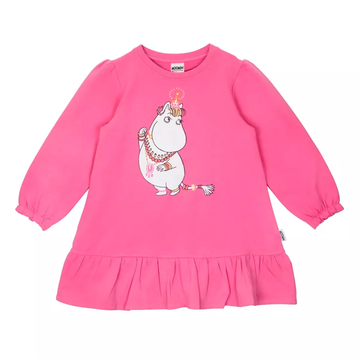 Martinex Niiskuneiti Klänning i rosa är en vacker A-linjeformad klänning för barn. Den är lätt att kombinera med andra Muumikläder. I den rosa långärmade klänningen finns en söt bild av Niiskuneiti som bär vackra smycken.